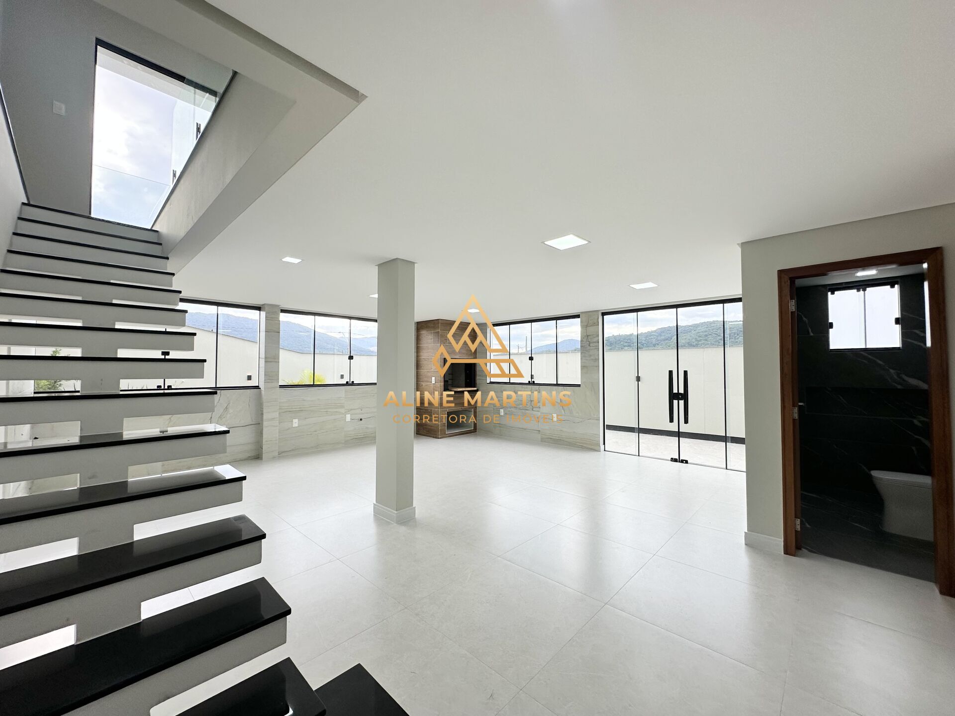 Belíssimo padrão de acabamento, piso e azulejos de porcelanato de primeira linha, teto rebaixado em gesso, leds embutidas, esquadrias pretas, nichos nos banheiros, escada com proteção de vidro temperado, fechadura e portão eletrônicos.